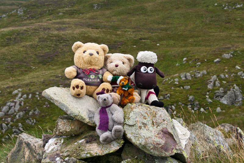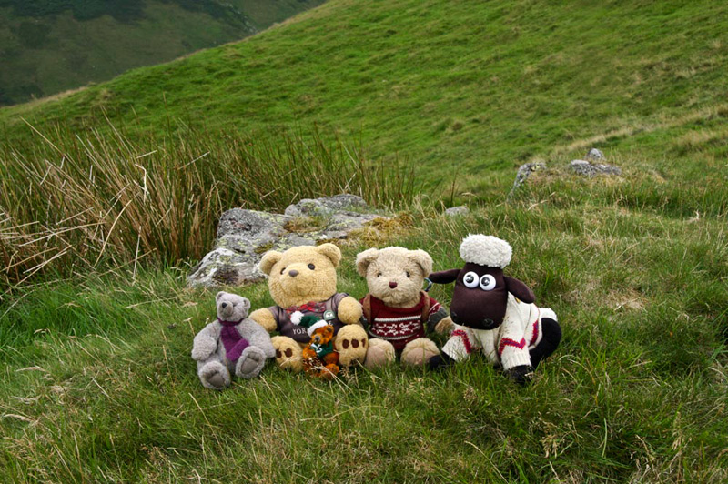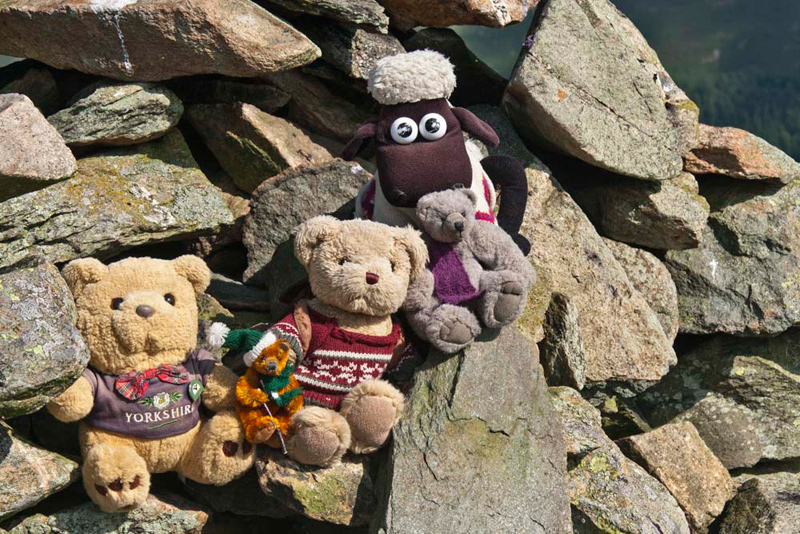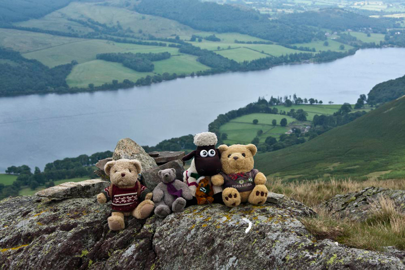 While this was going on a  family from Leighton Buzzard arrived, who were  staying in Watermillock.  Their son (Ted) was fascinated by us, and his Dad took his photo with us.  He especially liked Little Eric.  All in all it was a very lively time on Place Fell and we will remember this for a long time.
