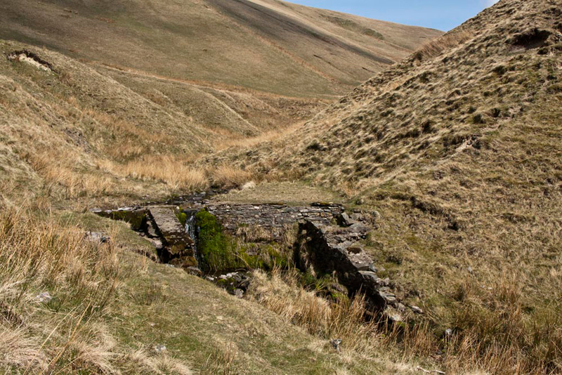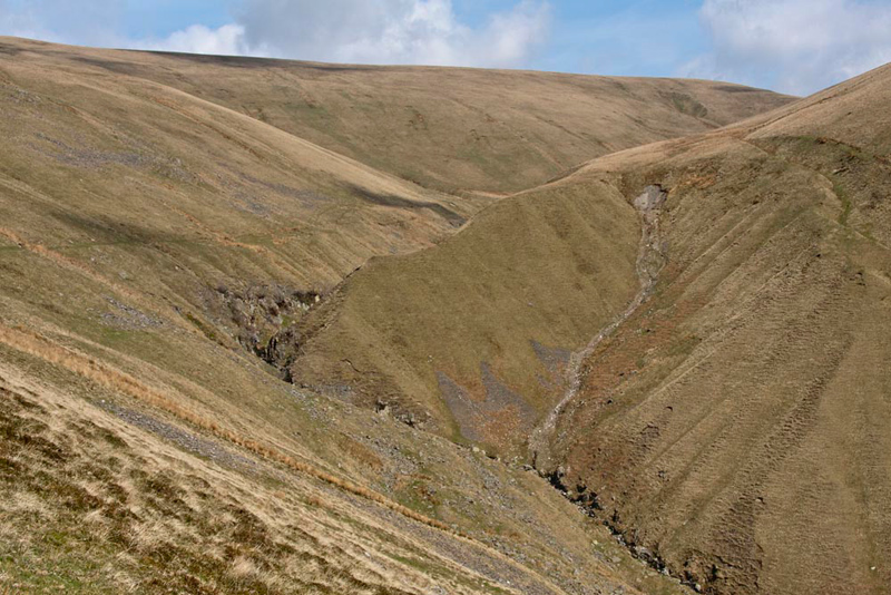 The slopes of Crook are to the left, and the path can be seen that took us further up the gill, to come to this small dam.