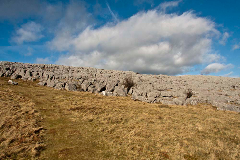The track can be seen clearly in the above picture. Coming to a line of small limestone crags, we followed it up through them, and so come beside a tall wall, with extensive limestone pavement to our right.