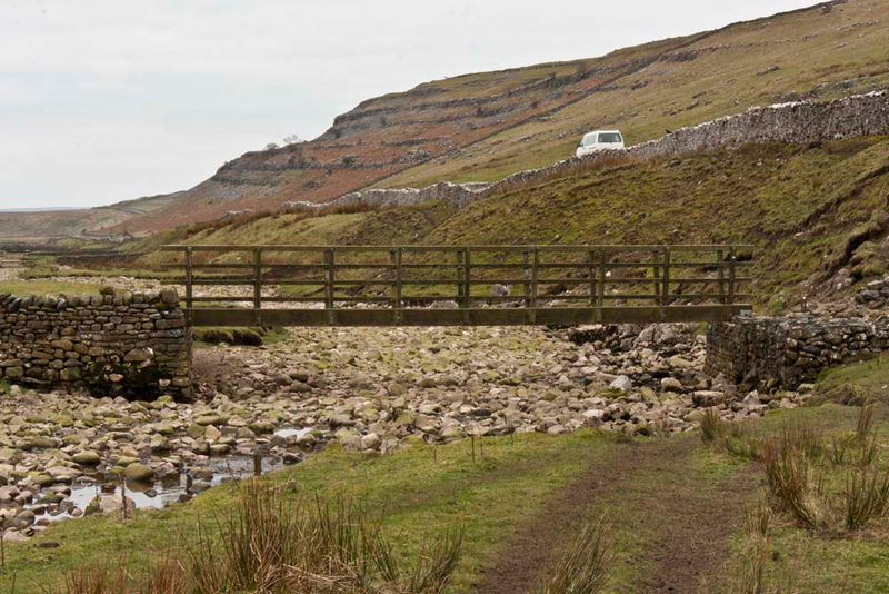 Beyond the farm the path led on for about a mile, a number of walls being surmounted by stiles, and bringing us below Twistleton Scar End, to a track. It was right here, crossing the footbridge over Kingsdale Beck, to the road. We include this shot taken from the footbridge in 2004.
