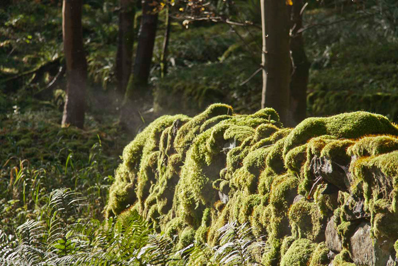 We liked this section of old stone wall, covered in moss, the sun making steam rise from it. "I wonder how many years it has taken for the moss to cover the stones?", mused Allen.