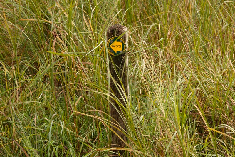 The path crossed the headland, and then beyond a gate, went left, as indicated by one of the many Cumbria Coastal Way waymarks we were to see today.