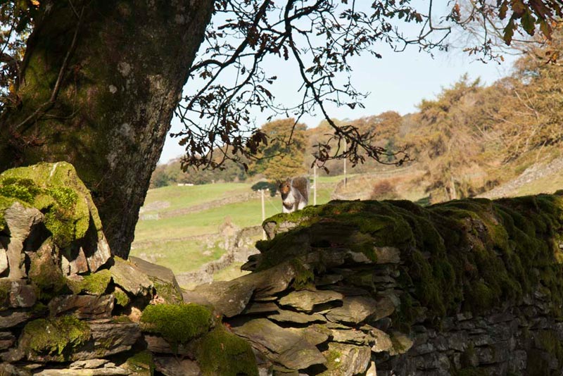 The wide clear track continued on passing through a gate, with a wall to the left. Suddenly, Tetley whispered, "look there's a squirrel on the wall."