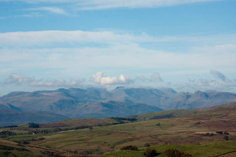 The Crinkle Crags can be seen just left of centre, and going right the depression at Three Tarns. Right of this is Bowfell just out of the cloud, then Esk Pike covered by cloud and the bulk of Great End. Unmistakably right of this are the Langdale Pikes, with behind the pudding basin shape of Great Gable.