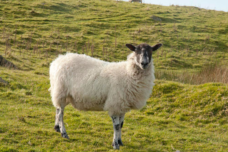 A clear path wound its way down, coming to the stile in the wall, that we had crossed this morning. Went on to cross the dry out flow then immediately turned left on a wide grassy path. As we walked along here, we were undone, as a sheep stood and posed for Dad.