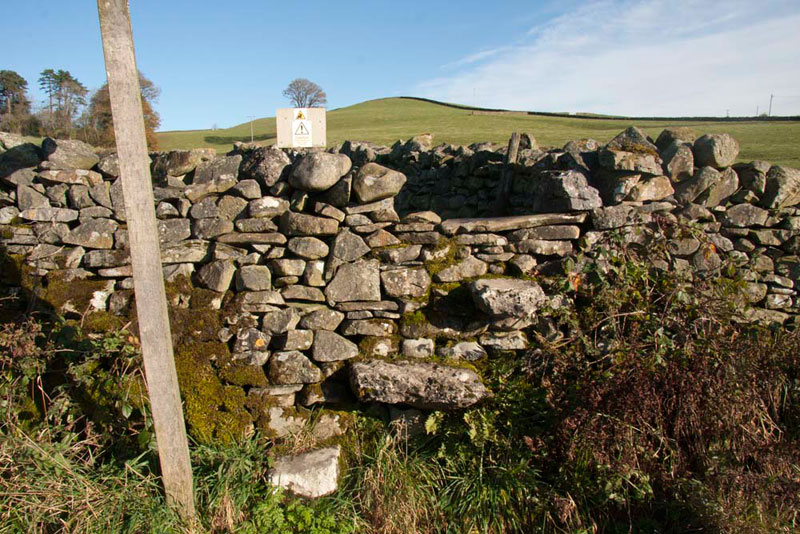 Just a little way right we reached the house called Mount Pleasant. Here walked through the yard and then over the clearly waymarked stile into the field beyond. Crossed this to the gate at the top, where it was right along by the wall, drifting slightly left to take stile in the cross wall and so down to climb a ladderstile and on to reach a road.