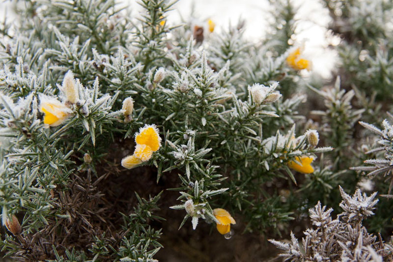 Over the footbridge we turned left, passing between gorse bushes, the flowers frost bound this morning, to soon join the railway track bed once again.