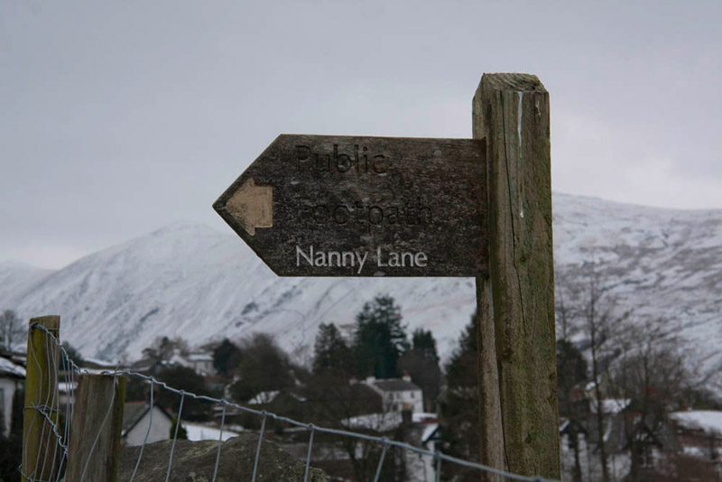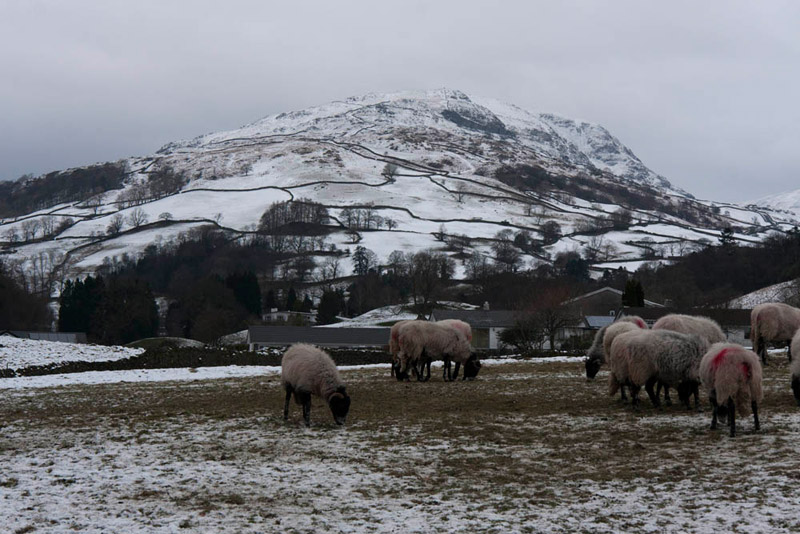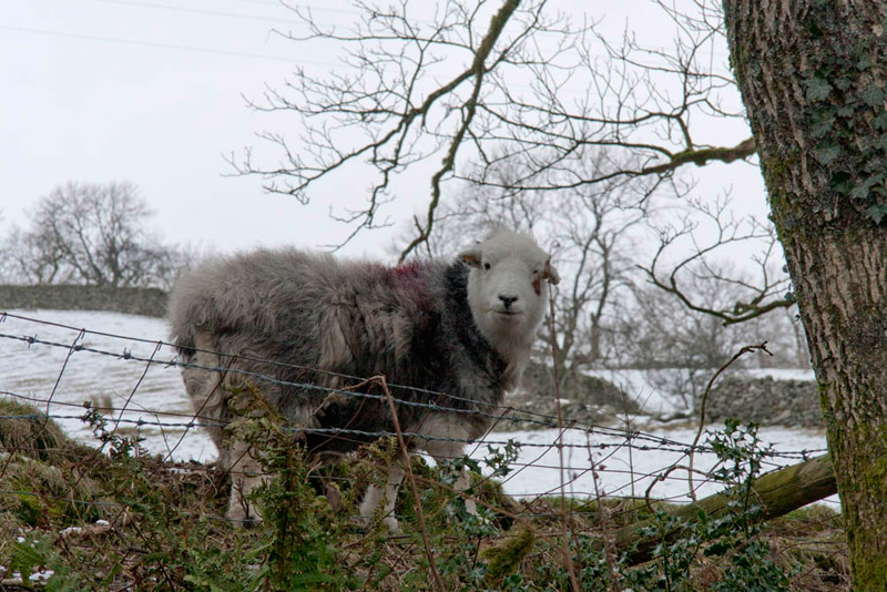 The track was now descending steadily towards Troutbeck and became snow free. We normally prefer it when Dad sees sheep that they turn tail and run, thereby denying him the opportunity of getting a picture. However we love the Herdwick sheep that roam the fells of the Lake District, so when Dad saw one standing by the fence, we were happy for him to take the picture.