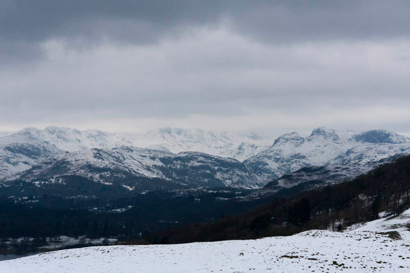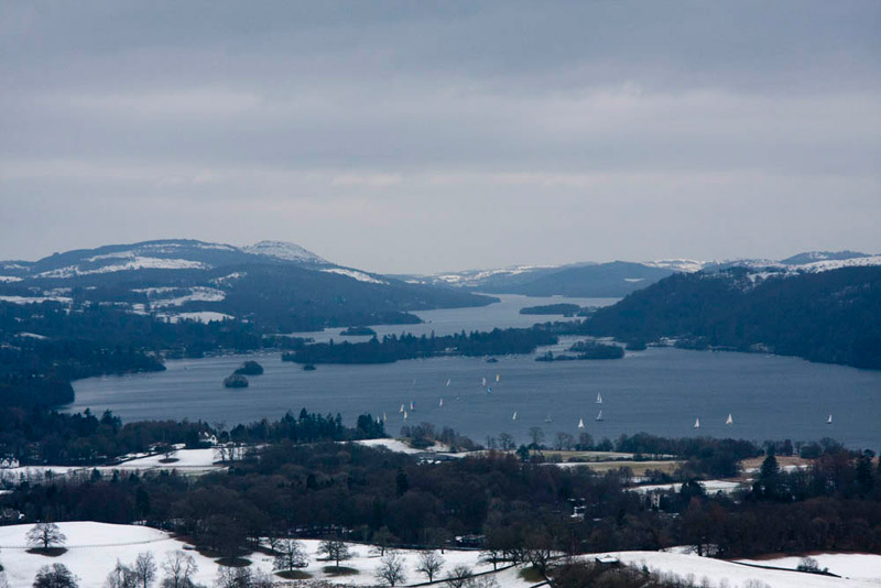Shaun said, "that is the marina at Low Wood Hotel down to the left, while across the lake the snow covered hill is Latterbarrow, with the tall obelisk at its summit."