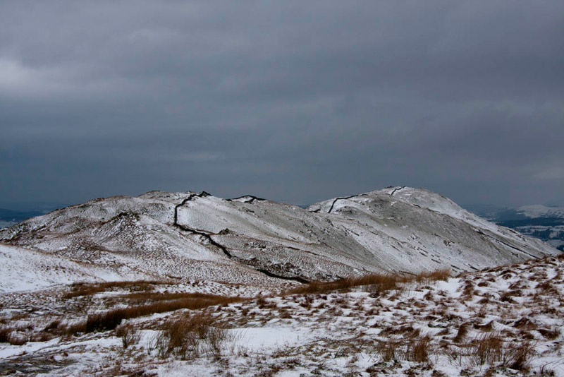 The last of the steep snowy descent, brought us to a track by a wall. Here we turned left following this down eventually to a road by some new houses and so to the car.