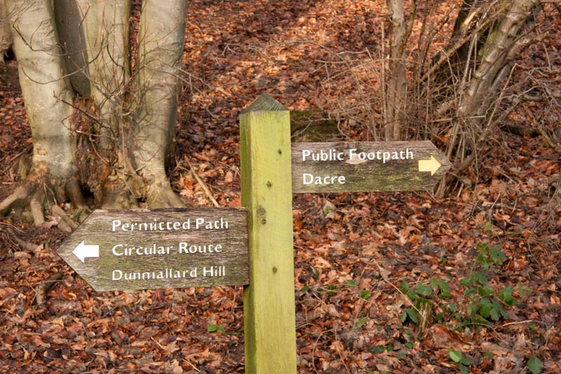 After a little while the path levelled out and we reached the signpost directing walkers right out of the trees and over a stile on the path to Dacre.