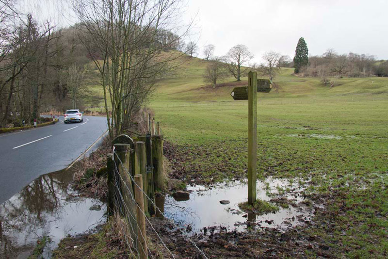 Beyond the building a succession of waymarks led us through the caravan park, to emerge via a stile into a field . This was crossed to a gate into the field we had walked over earlier and led back to the flooded gate onto the A592.