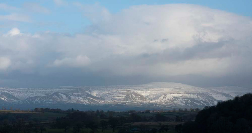 So, having been thoroughly educated in this bit of ancient history, we descended to main path again and continued on over the rough wet pasture to a stile, with this magnificent view of the Pennines with towering clouds, before us.