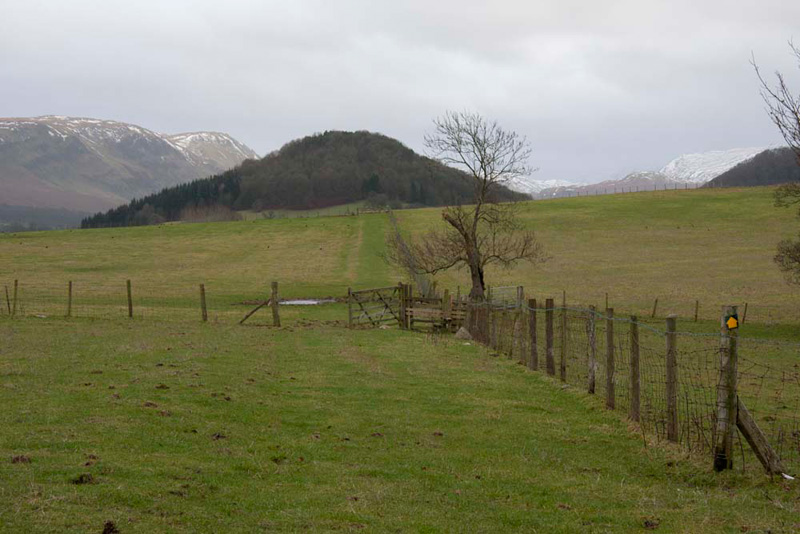 The trees clothing Dunmallard Hill were to the left and once we had reached their end, we continued on through a gate into an open field and then on to next gate.