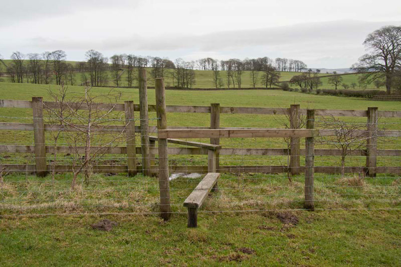 A stone step stile got us over the cross wall, followed immediately by a wooden step stile in a fence.