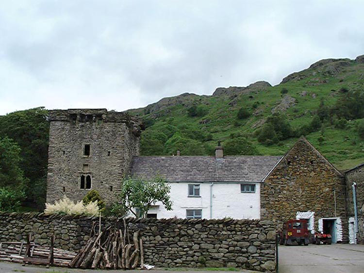 As can be seen Kentmere Hall was originally a stunning 14th century tunnel-vaulted pele tower with five-foot thick walls, that now has a 20th century flat roof replacing the original pitched roof. It was originally 4 storeys including a vaulted ground floor and turrets. One of the original windows and the spiral staircase remain. It has slit openings and as can be seen in the picture, there is a medieval window in the south wall of 2 trefoiled ogee lights in a square head with moulded label and a blank panel over. The tower was extended in the 15th or 16th century into a residence and is now a farmhouse.