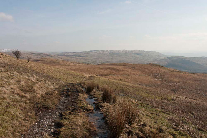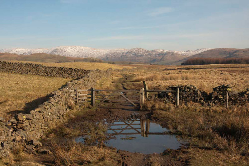 Initially the path was grassy and muddy, but soon developed into a narrow track that was muddy and flooded in places, as can be seen below, before one of the four more gates we had to pass through with walled pasture to the left and open land including Mickle Moss to the right. The snowcapped fells are the eastern side of the Kentmere Horseshoe, from left to right Harter Fell, Kentmere Pike and Shipman Knotts, with on the far right Green Quarter Fell.