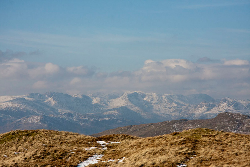 Helpfully Tetley replied, "we are looking over Applethwaite Common and indeed the magnificent mountain prospect is the Coniston range. From the left Coniston Old Man, Brim Fell, Swirl How at the back with the bulk of Wetherlam in front. Far right is the ridge known as Wet Side Edge with Hell Gill Pike that descends to the Wrynose Pass."