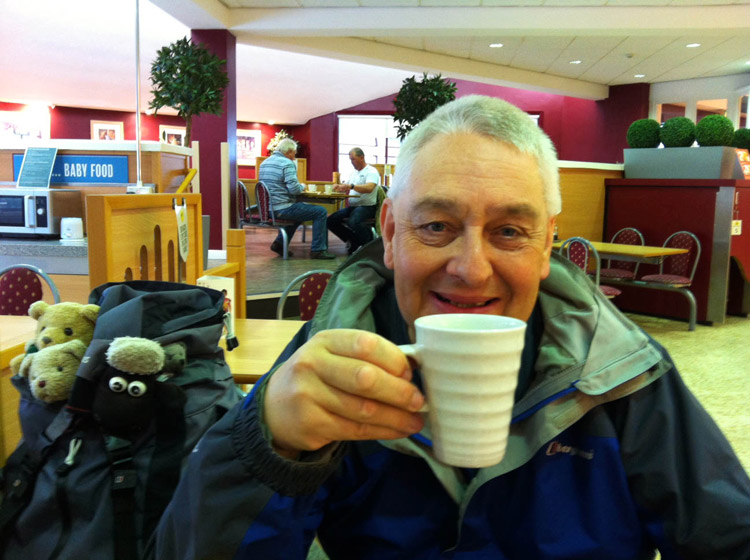 The store was open, but only for browsing until 10.00am. We wandered round the store, a completely new experience on a walk for us, and soon the socks were found. However as they could not be paid for yet, Uncle Bob left them on the shelf, and to kill the time until, we went to the cafe, for a mug of tea, Uncle Bob taking this 'mug' shot of Dad.