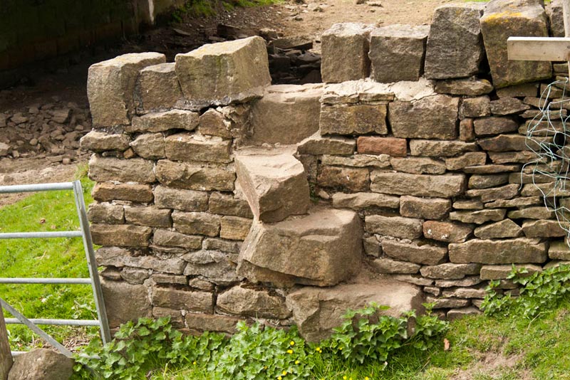 Then we settled in the rucksack again, and headed north beside the river, but after a while cutting off a loop by going directly across a field. This soon led to this substantial stone step stile, where beyond it can be seen that the ground dropped away, to pass under the railway bridge.