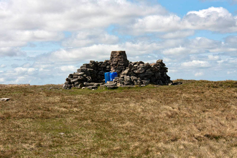 And so, Dad turned right from the ascent path and strode off towards the summit seen distantly ahead. The path was grassy and a bit muddy in places, with very little ascent to reach the shelter that surrounds the trig column,