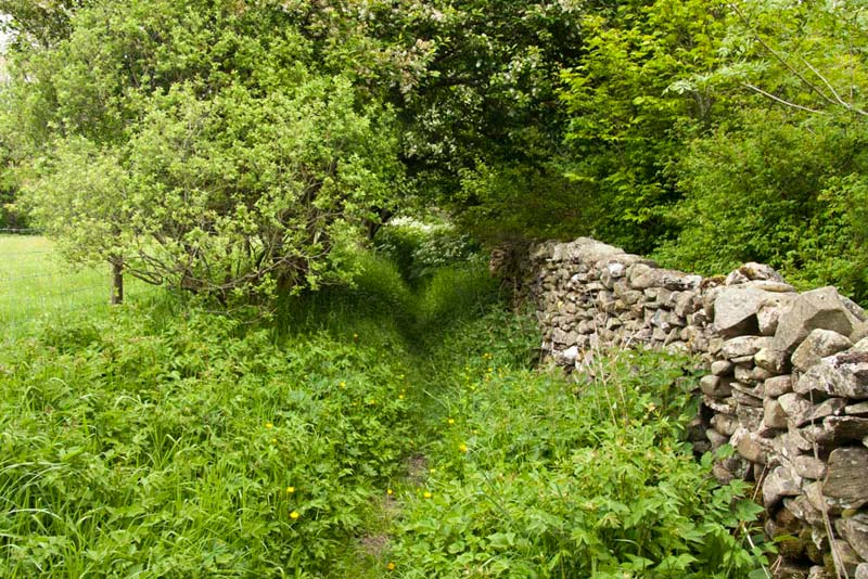 The path was grassy and overgrown, taking us along with the wall on the right,