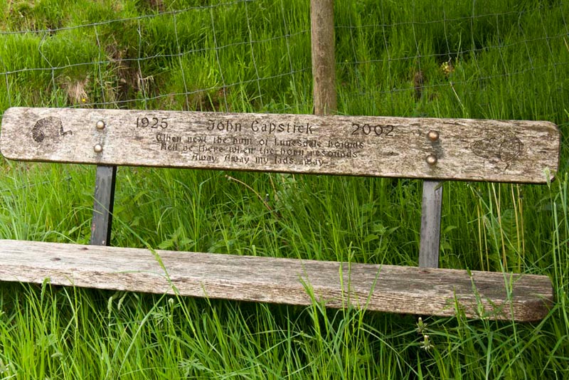 As we approached the iron gate to the path, Shaun said, "there is a seat to the right bearing a dedication", so Dad went over to investigate.