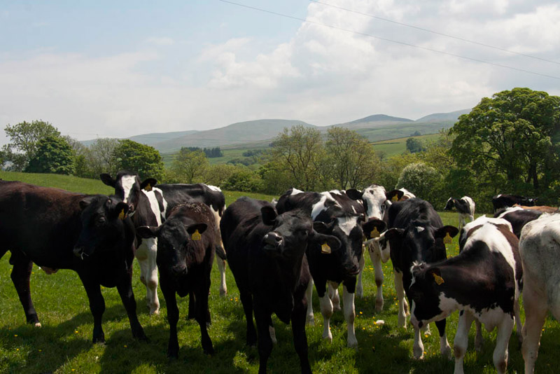 Then it was just a case of keeping on in the same direction all the way, using the stone step stiles over the walls, passing above Marl Crag and on to approach finally Raisgill Hall. Just before we had to deal with some inquisitive young cattle, but Dad got over the stile before they got to us!