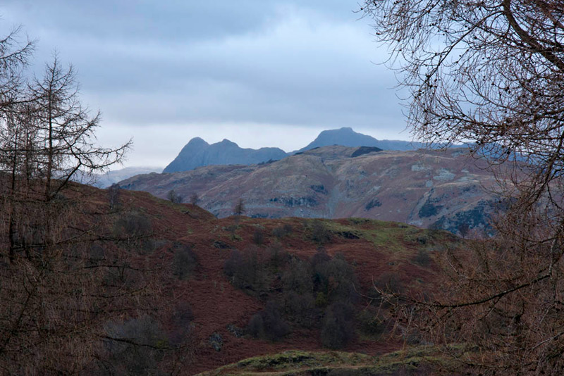 So, we just kept on the wide stony track, that then climbed for a little way, giving yet another fine prospect of the Langdale Pikes, in a dark silhouette against the the cloudy sky.