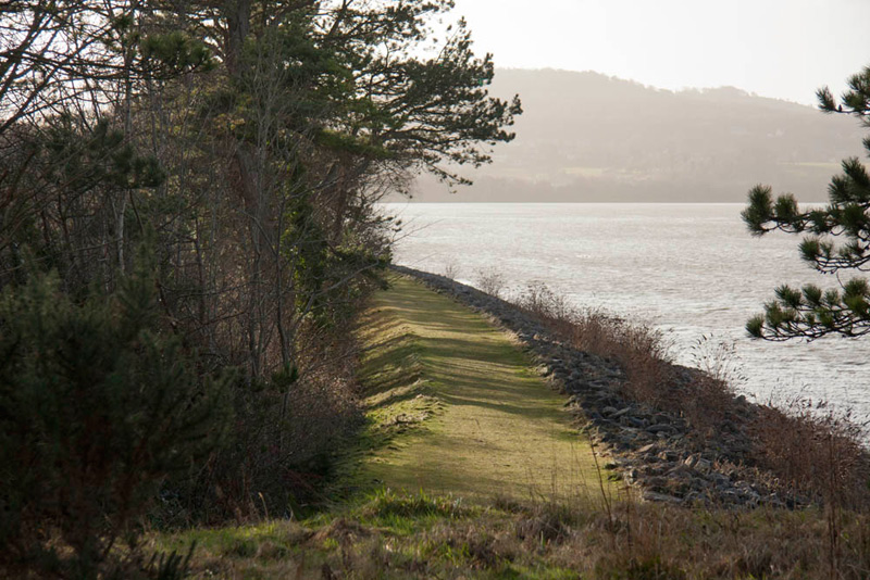 Exiting on to the road again, it was left up to where it makes a sharp bend left across another bridge now filled in over the track bed of the railway. Here we climbed the crash barrier and descended to the track bed beyond that hugs the estuary.
