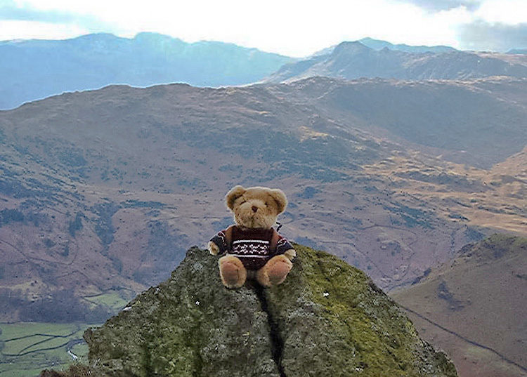 Without a doubt this is a vantage point for superb views, particularly to Grasmere lake and village. The fell to the right, with the sun shining on it, is Silver How, which was Dad, Shaun and Tetley's last Wainwright. The distant lake is Coniston Water.