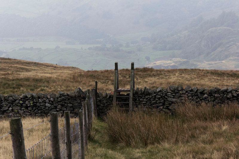 Then having climbed the fence we walked on by it to cross the ladderstile in the wall. Distantly behind can be seen part of the Kentmere valley.