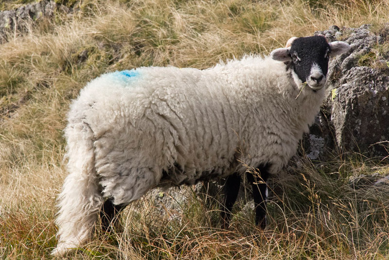 We were now quite near to the end of the walk, apart from the return along the track, and we dared to hope that we might get through this story without any photographs of sheep. But just when we thought it was safe, the path took us past a few blackfaced sheep. Dad had the camera out and snapped off a shot, but it was not very good. Great we thought, but then just a minute later another stopped eating the grass and posed beautifully.
