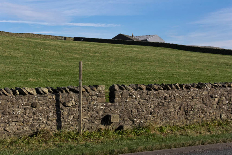 Turning back and passing the telephone box again, it was then across the bridge over the beck, and immediately right on a rough track with a wall to the left, that was followed to its end and over a stile into a field.