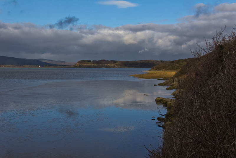 The path now climbed to join another, where we went right on the cliff top path running from Arnside Point to Park Point. Shortly we did stop to admire the view, as with the weather now improving and blue sky beginning to show through the clouds, there were some nice reflections in the sands.