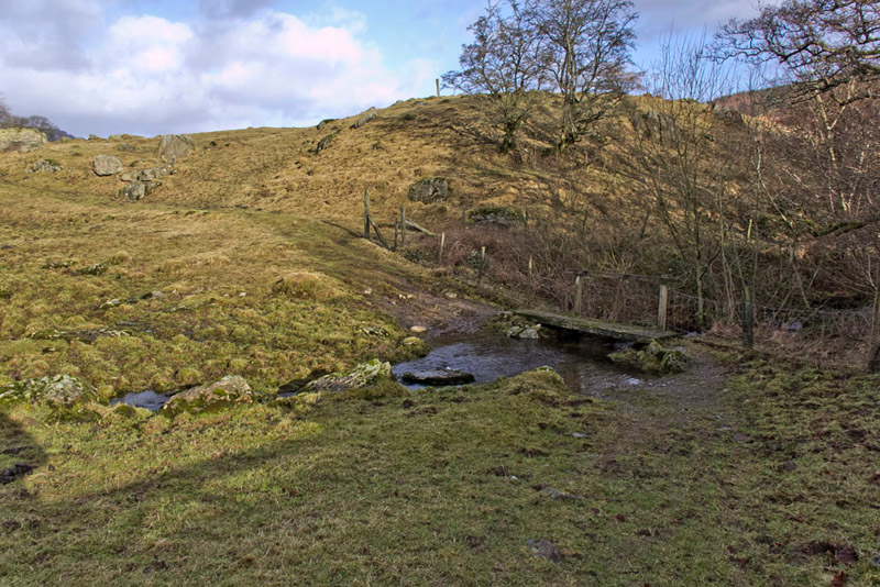 Beyond we climbed to a gate and then on up the field passing to the left of a building, to go through a kissing gate and cross a tiny bridge to the buildings at Grassgarth. This is the bridge and gate looking back.