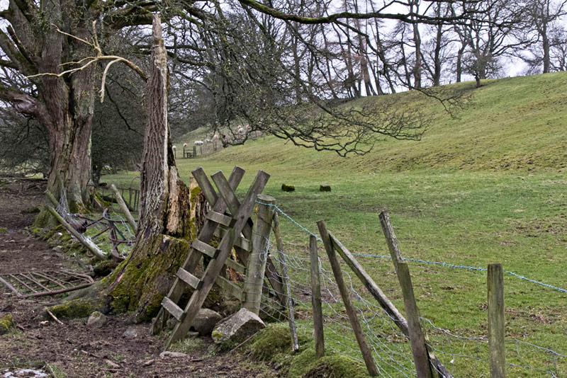 At the end of the hamlet we passed though a gate on to a grassy way that descended gently passing through gates to High Dalebanks. Now metalled the track led on towards Low Dalebanks, passing on the way this hollowed out trunk and roots of a once substantial tree.