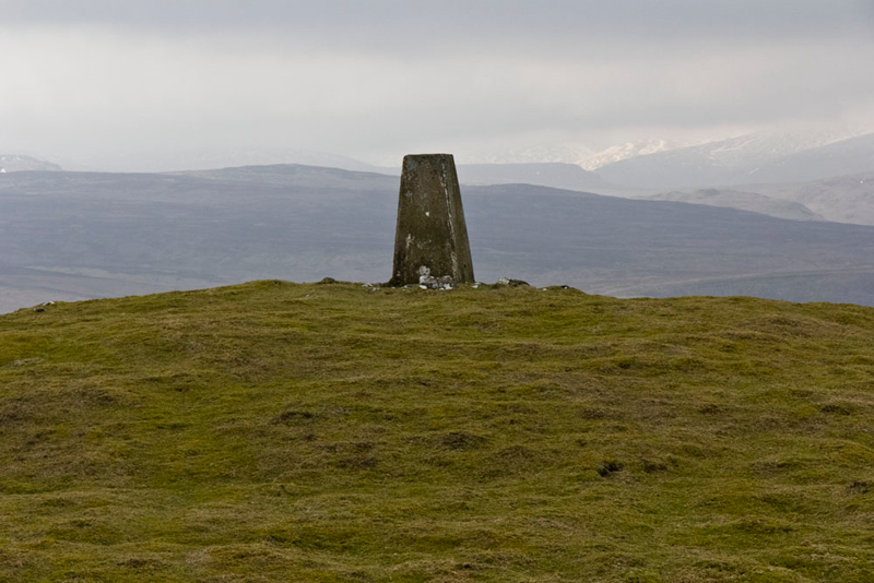 A path led to a waymark, after which the way was trackless over rough grassy and heathery terrain and passing some grouse butts. Looking back the conifer plantation now seemed a long way away. Dad ploughed on then suddenly Little Eric called out, "look that there's the summit. Two prominences, one with a cairn and the other with the trig point."
