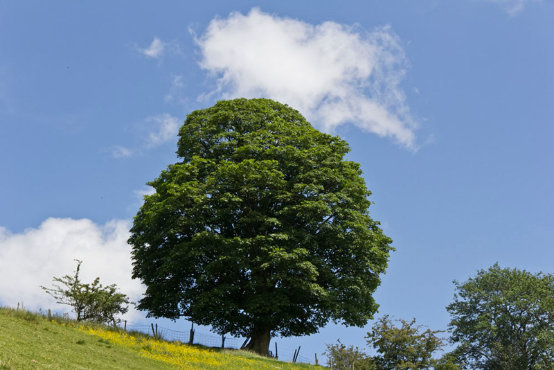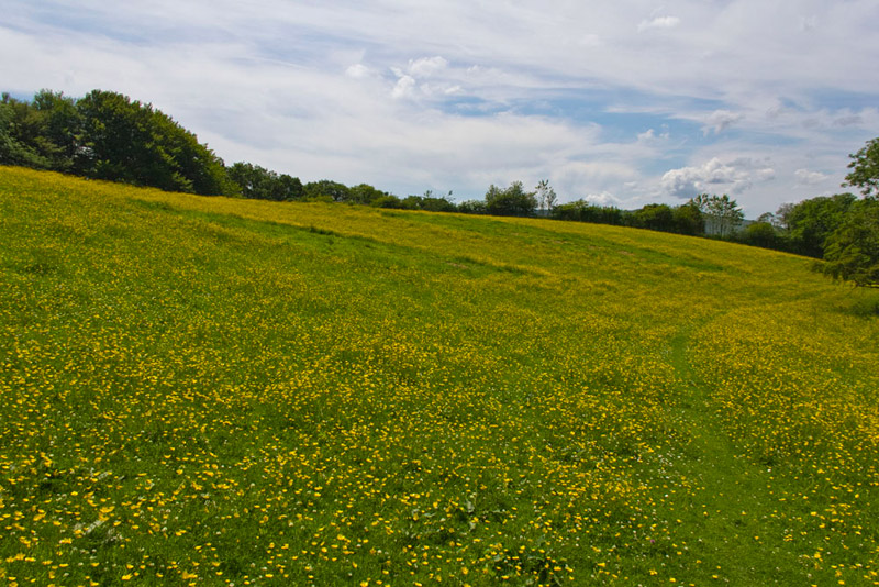 Onwards through a gate the pasture was yellow with buttercups and above this prominent tree made a nice shot against the blue sky