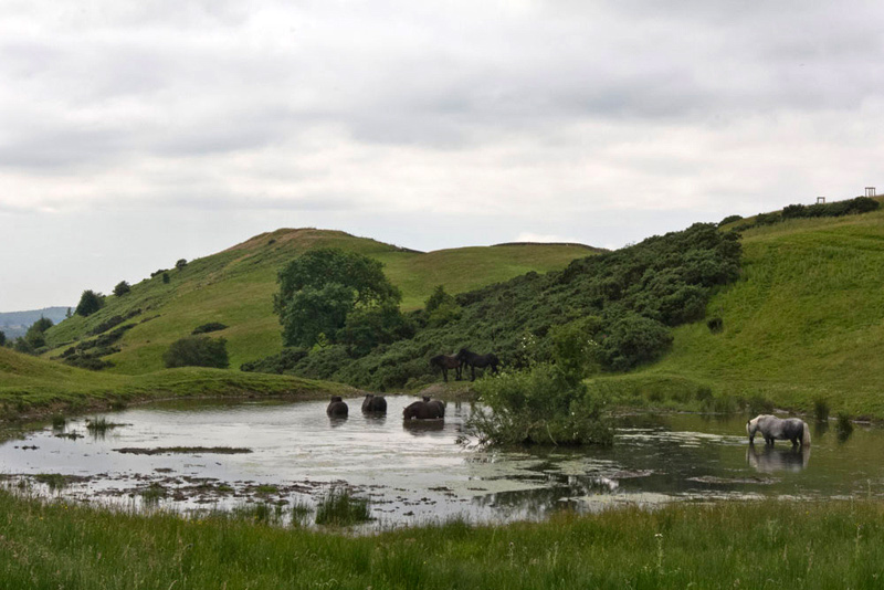 A sign on the gate informed us that 7 wild ponies and 7 cattle have been allowed to graze on The Helm. A grassy path was followed soon coming to a tiny tarn, where the horses were bathing.