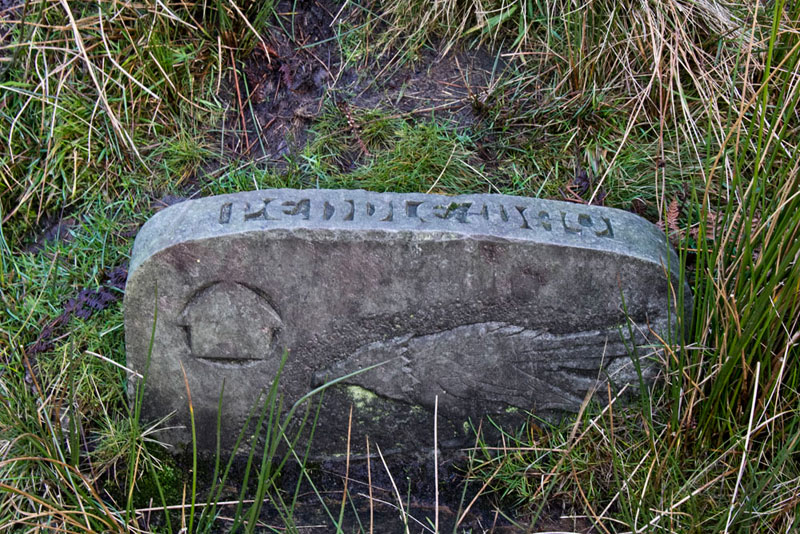 The rough path climbed steeply to gain the top of the ravine of Boar Clough, after which the gradient eased as we walked on to a junction, where there was another inscribed stone.
