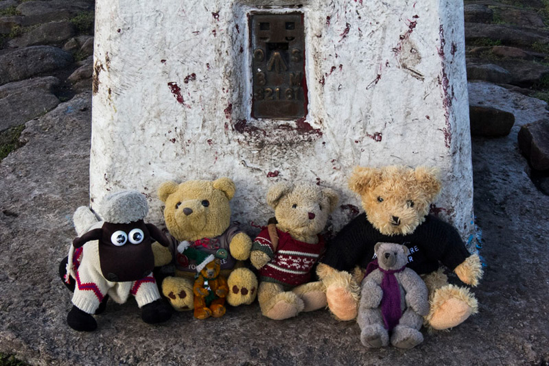 Too windy we had to be content to sit at the bottom of the trig point while Dad took our picture.