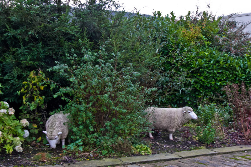 This was soil, reinforced and cobbled at times as via a number of kissing gates took us past Brown House, where these sheep statues stood on the garden...