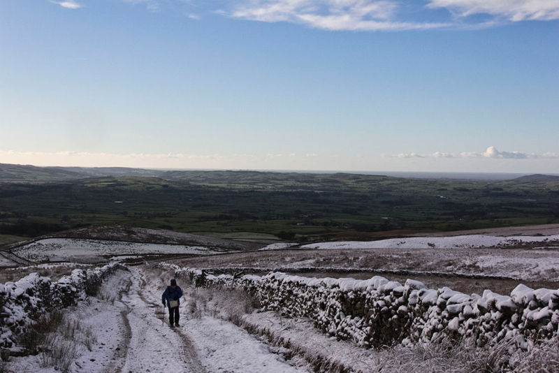 The track called the Turbary road was snowbound and Uncle Eric can be seen making the climb, while distantly behind all is green stretching away to the coast.