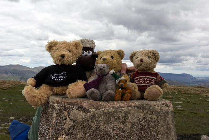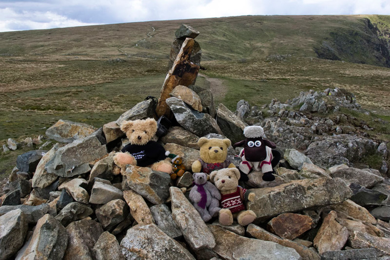 The last steep section was very eroded and covered in loose stone and we were all glad to reach the cairn and get to the grassy top. From here it was just a relatively short stroll left to the trig point. Another bag for Uncle Eric and Southey, and we were quick to sit here again for our picture.