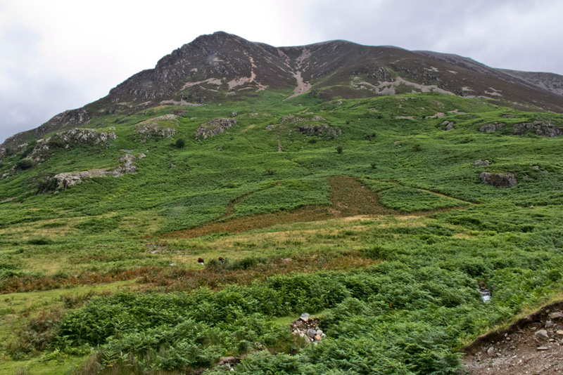 So now all that remained, was to make the at times steep and rough descent to Hause Point and the road. Near the bottom, there was this superb view of Haystacks, backed by Green Gable and Great Gable. Kirk Fell fills the gap between Haystacks and High Crag.