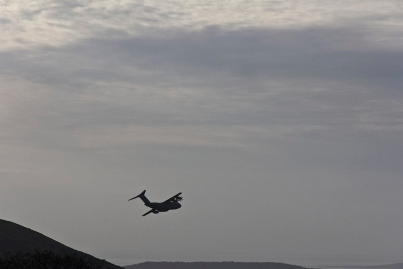 Suddenly a military transport plane soared by. "Get a picture please", called out Allen."