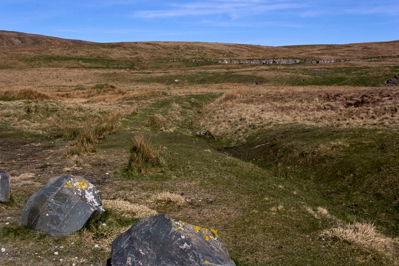 Dad strode on to cross the aqueduct, from where we could see the entrance to Bleamoor Tunnel. Having primed himself with the information, Tetley said to Southey, "the tunnel describes and arc through Blea Moor hill and is 2629 yards long (2404 metres). If you look up the hillside (far top right of picture), you can see spoil heaps from digging the tunnel, removed by lifting it up shafts, that then later became ventilation shafts, the deepest being 360ft. It took from 1870 to 1875 to complete."