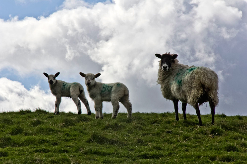 The debate over, Dad quickly climbed the gate and then headed right above the wood with a slight hill to the left, where this ewe and lambs watched us pass by.
