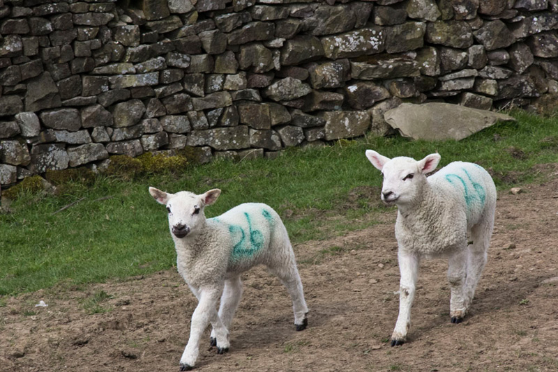 Beyond the rise the path descended rounding a wall corner to bear left to a ladderstile onto the A65. Close by these lambs posed, Southey saying, "picture time again."